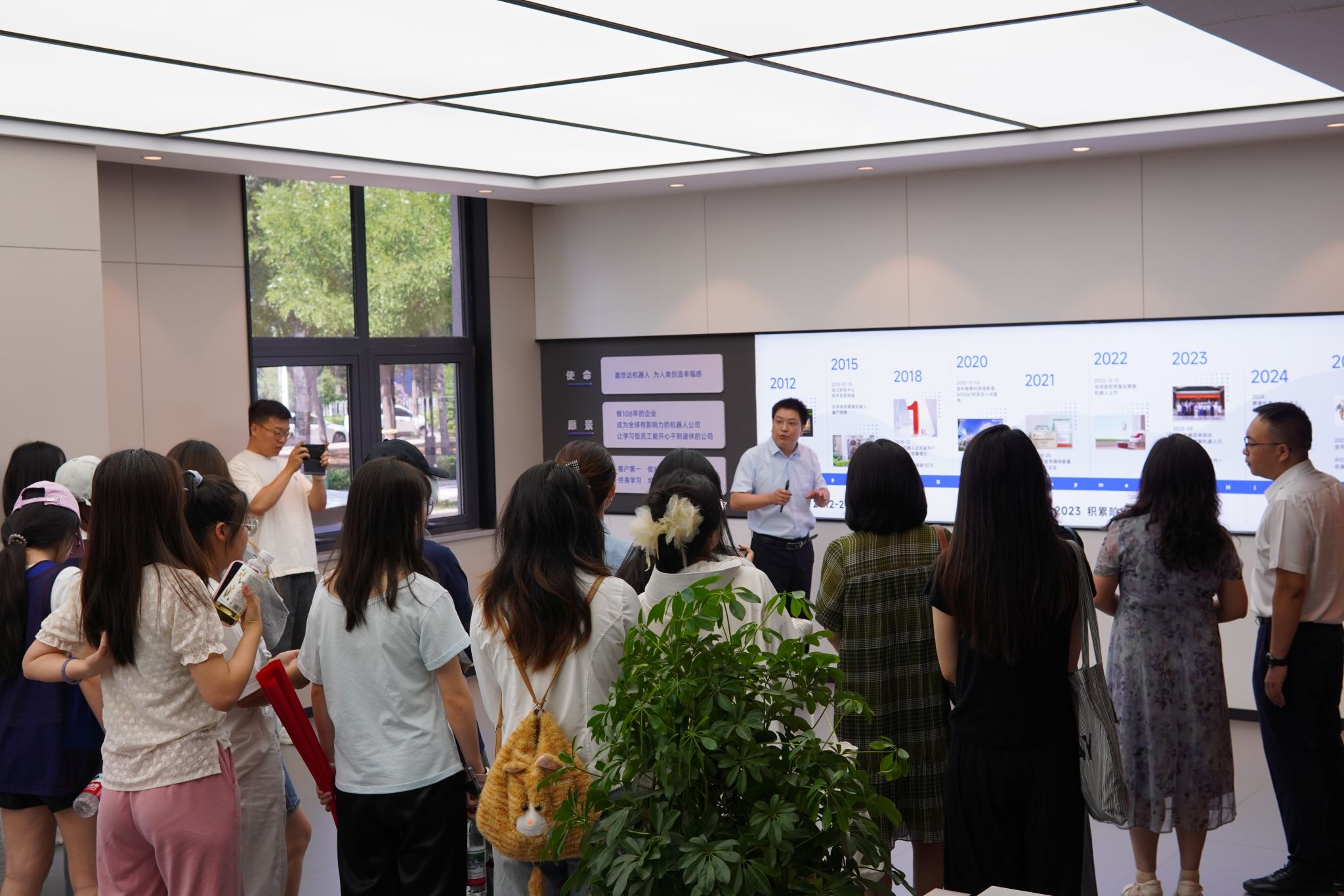 活动开始,在孙晓普的陪同下,师生们先后参观了企业展厅、智能化生产线及研发实验室。作为国家级专精特新“重点小巨人”企业,嘉世达专注于人工智能领域垂直立面机器人的研发与生产,其核心产品“洒拖”系列机器人凭借高效清洁技术和AI算法,远销海外市场。参观过程中,蒲勇详细讲解了机器人从设计、组装到质检的全流程,自动化设备的高精度运作和严谨的品质管理体系让同学们深刻体会到“山西智造”的技术实力。