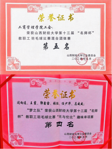 的参赛选手们凭借团队间的默契配合和出色的竞技水平,一路过关斩将:小组赛中3:0战胜机关3,2:1战胜会计,2:1战胜金融,3:0战胜国贸,以小组第一进入八强,最终取得了第五名的优异成绩。任少华、张征、马威威、闫向连、王霞、郭鑫鑫6人组成的梦之队经过前后6场的角逐,最终获得教职工羽毛球无与伦比趣味赛第4名的好成绩。