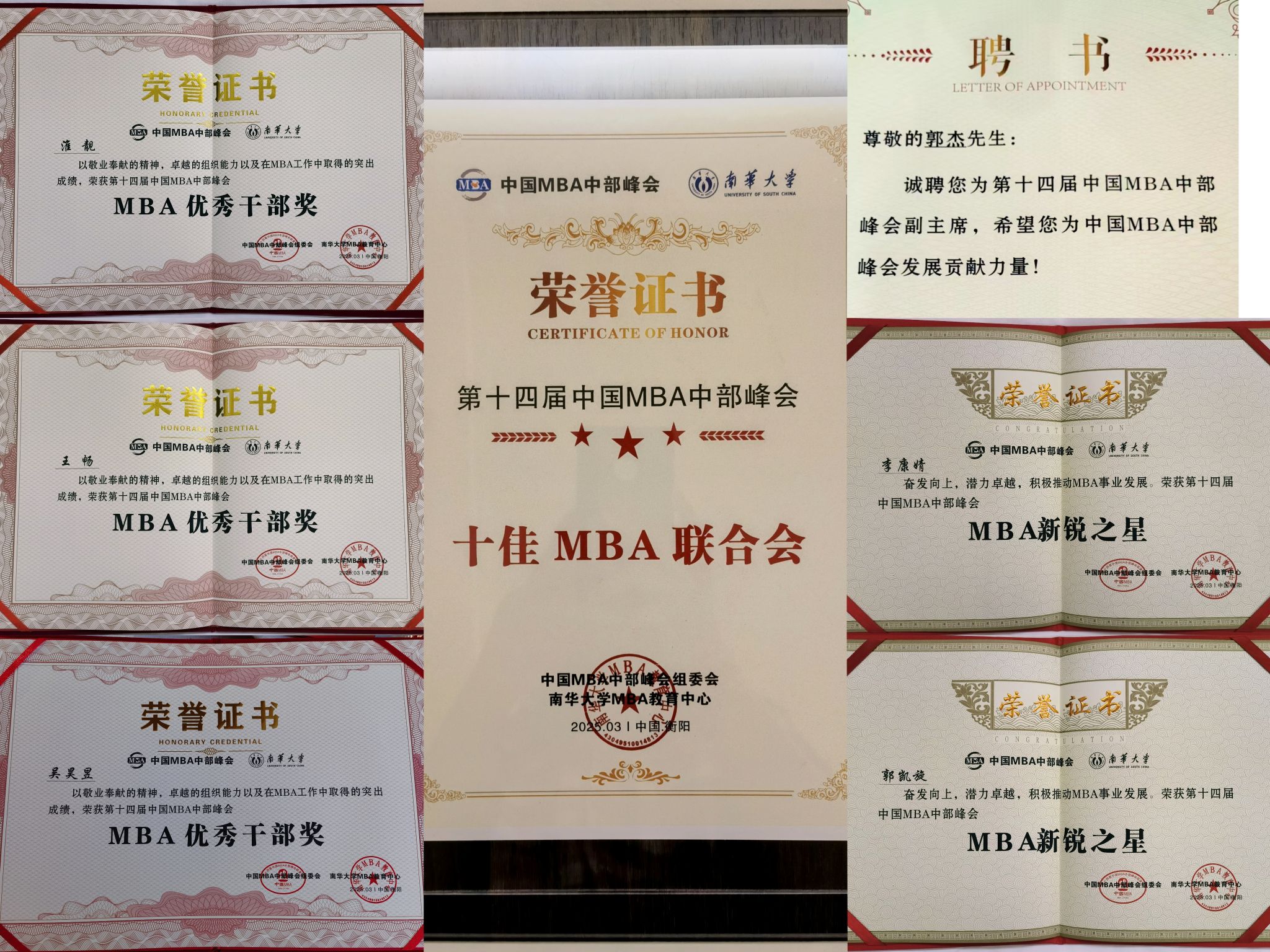 第十九届MBA联合会获得“十佳联合会”称号,联合会主席郭杰当选第十四届中国MBA中部峰会副主席,联合会吴昊昱、淮靓、王畅获评“十佳MBA优秀干部”,MBA学生郭凯旋、李康婧获得“MBA新锐之星”。