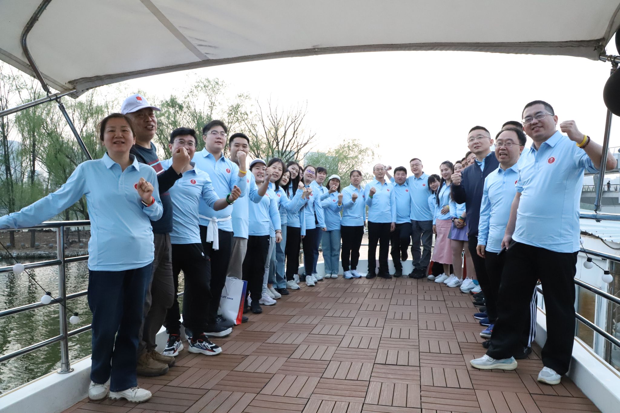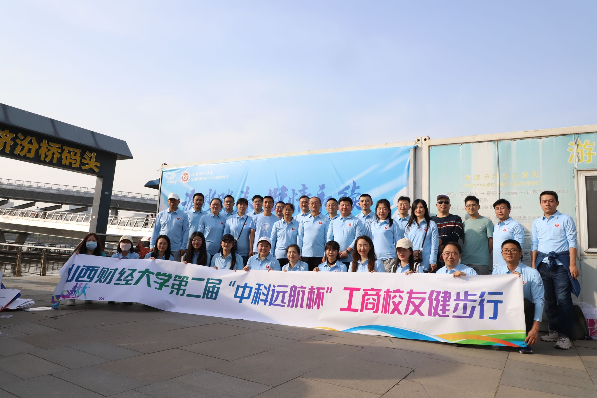 下午四点半,校友和老师们便早早地来到滨河公园跻汾桥东岸码头集合签到,统一着装。五点整,健步走活动正式开始。