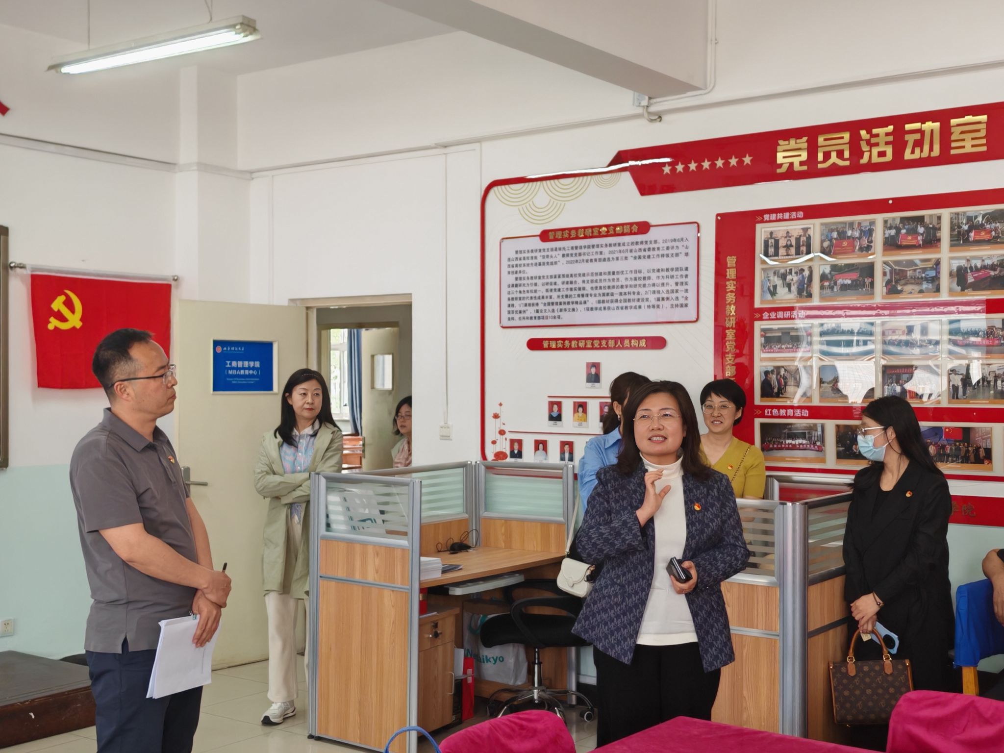 副院长、管理实务教研室党支部代表薛继东以“党建引领强根基,创新驱动促发展”为主题,系统分享了样板支部建设的先进经验。她重点介绍了在样板支部建设、“双带头人”培育、党建与业务融合、品牌活动打造等方面的创新实践。全体党员实地参观了管理实务教研室党支部的党建文化墙、党员活动室及成果展区。参观过程中,党员们围绕“如何提升支部凝聚力”“如何破解党建业务‘两张皮’”等问题展开现场交流,管理实务教研室党支部委员逐一解答,为其他支部提供了可复制的经验。