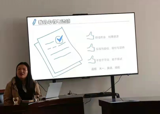她强调,积极工作和实践是大学期间的必修课。她分享了自己在保研过程中的心路历程与感悟反思,鼓励大家积极承担学生会和班级工作,积极参加各种比赛和活动,在一次又一次的工作和实践中,提高自身学用结合、学以致用的本领,勇于跳出自己的舒适圈,发掘自己更多的潜能。
