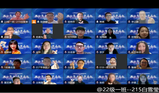 随后,班级里的同学们按照顺序依次作了自我介绍。同学们声音洪亮,语言幽默,热情洋溢的脸庞上透露着对新学期、新同学、新老师的热爱和能够线上见面的喜悦。同学们分享自己兴趣爱好的同时也纷纷表示,在今后的学习、工作和生活中,一定会牢记山西财经大学“修德,立信,博学,求真”的校训,与时代同频共振,练就过硬本领,投身强国伟业,不负韶华,不负时代,不负青春。