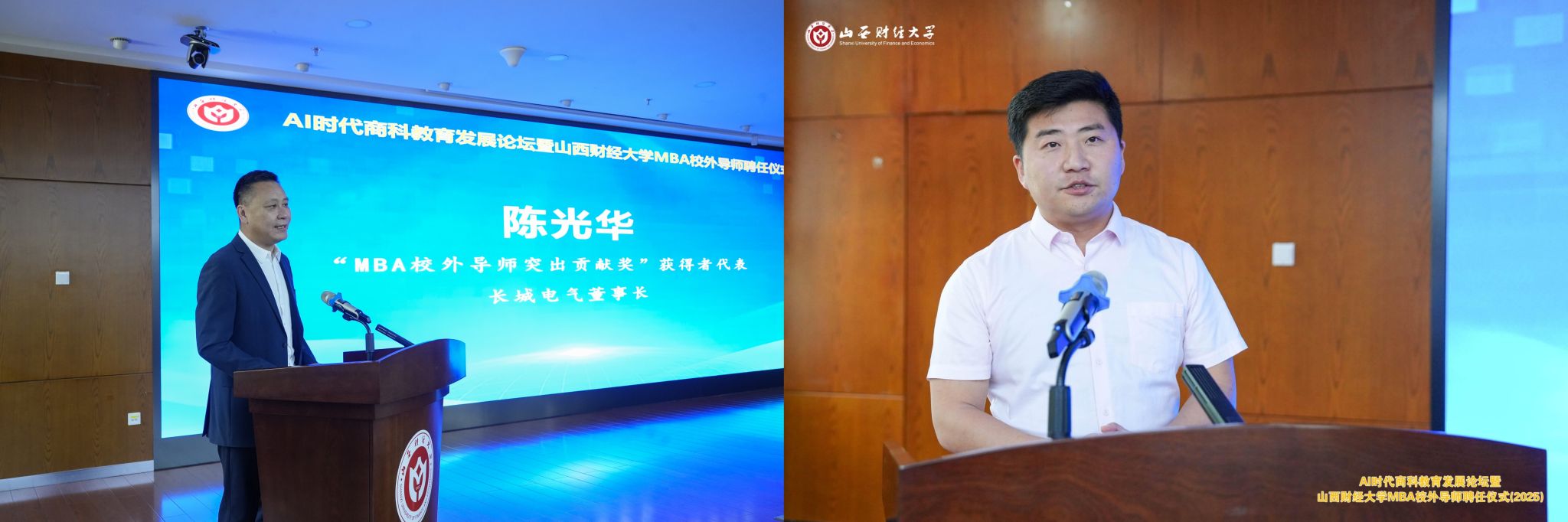长城电气股份有限公司董事长陈光华作为“MBA校外导师突出贡献奖”获奖代表发言。他深情回顾了在母校的求学经历,表达了对母校培养的感激之情。他寄语MBA学生们要把企业当教科书,到企业一线去;要用问题驱动学习,带着职业困惑找老师;校友网络是宝贵财富,要善用校友资源平台。中科远航总经理徐强代表新聘MBA校外导师发言。提出要以产教融合为育人纽带,共筑校企育人平台;以利他共赢为发展纽带,传承晋商精神薪火;以使命担当为价值纽带,共赴价值创造之约。