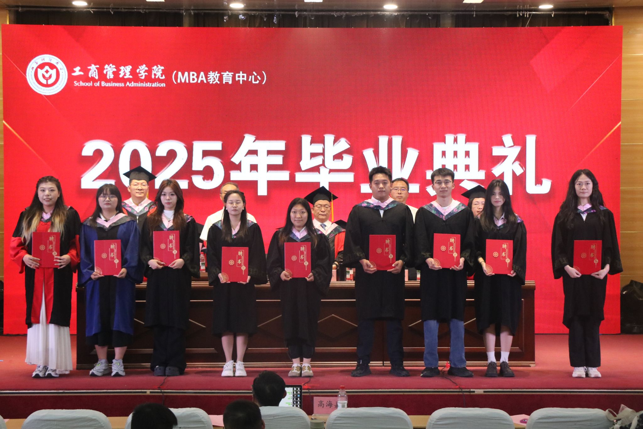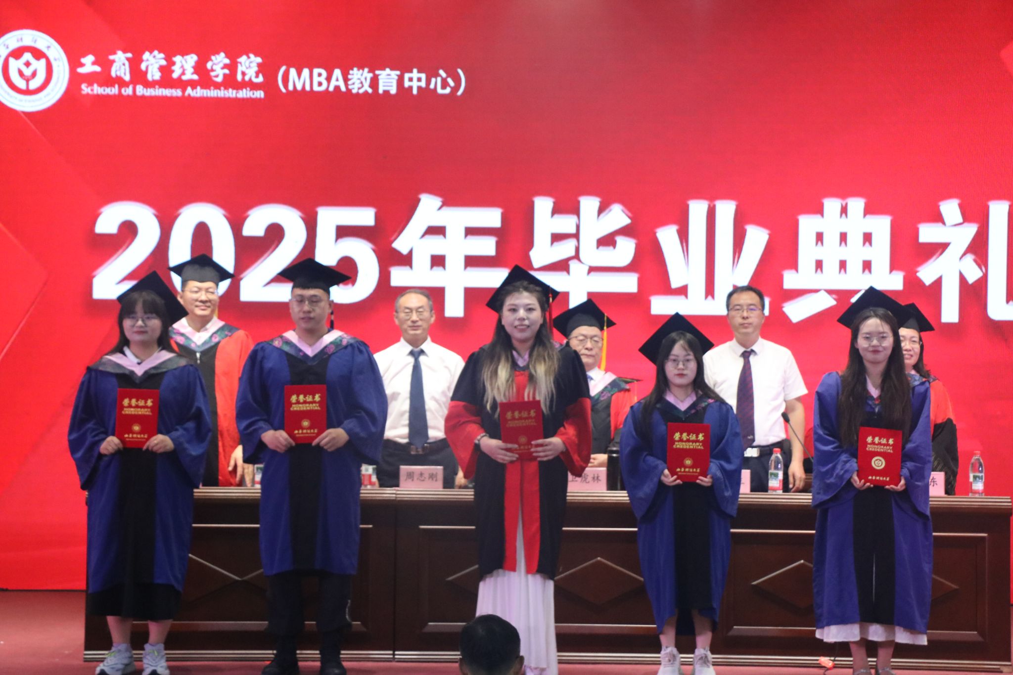 典礼现场,主席台领导先后为优秀毕业生颁发荣誉证书、为校友联络员颁发聘书。卫虎林院长为博士研究生逐一颁发毕业证书,主席台全体人员共同为学术研究生和本科毕业生颁发证书,见证这一重要时刻。