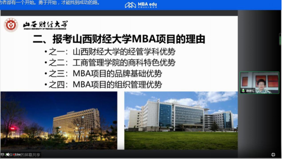 副院长、MBA教育中心执行主任薛继东应邀参加了由中国MBA教育网在线举办的“第五届MBA项目联展暨2022招生政策发布会(华中地区专场)”活动。本次活动主要从考生角度出发,对我校2022年MBA项目的招生信息、报考理由和培养流程等与考生进行了分享,并举行线上答疑。