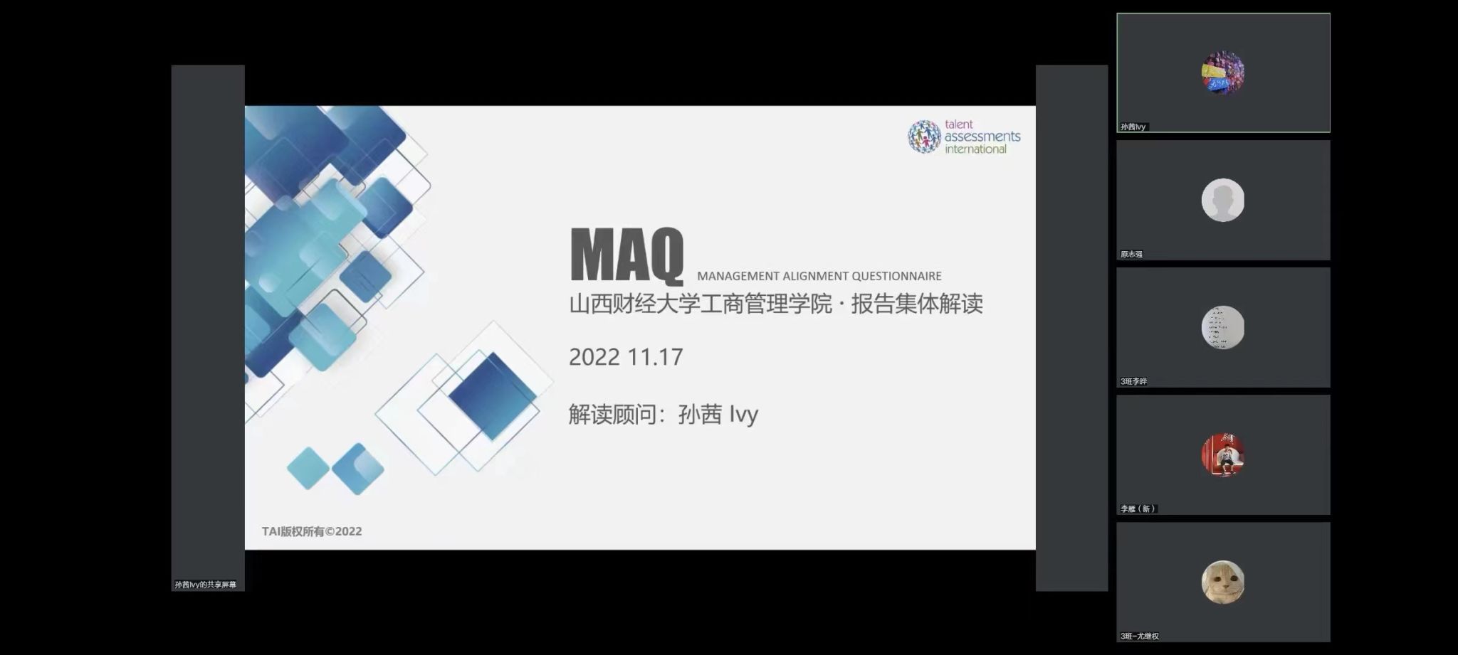 本场讲座特别邀请到简致咨询高级合伙人、MAQ认证高级测评分析师孙茜老师线上讲授MBA学生自我认知,并集体解读MAQ测试报告。讲座中,孙老师分别从项目背景和人才测评的基础知识、MAQ报告结构、MAQ22个维度释义、个人发展计划四个方面进行详尽分析,并运用大五人格模型等工具,帮助MBA学生进一步了解自己的管理风格、判断和决策潜力,就“确定发展方向”“分析自己的优劣势”等问题详细分享了发展策略,鼓励大家根据当前岗位和将来职业发展目标制定和执行个人发展计划,提高自己的胜任力,更好地实现有效的个人职业发展。