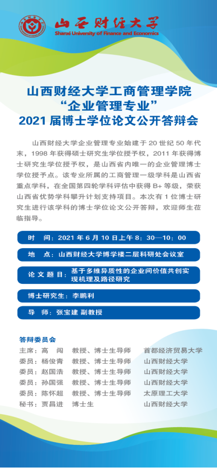 6月10日上午8:30—10:30免费麻将游戏下载 将举行2021届企业管理专业博士学位论文公开答辩会,地点在博学楼二层科研处会议室,本次共有1位博士生李鹏利进行答辩,首都经济贸易大学高闯教授担任答辩委员会主席,其他答辩委员有山西财经大学杨俊青教授、山西财经大学赵国浩教授、山西财经大学孙国强教授、太原理工大学陈怀超教授。具体答辩信息见下面海报,欢迎师生莅临指导。