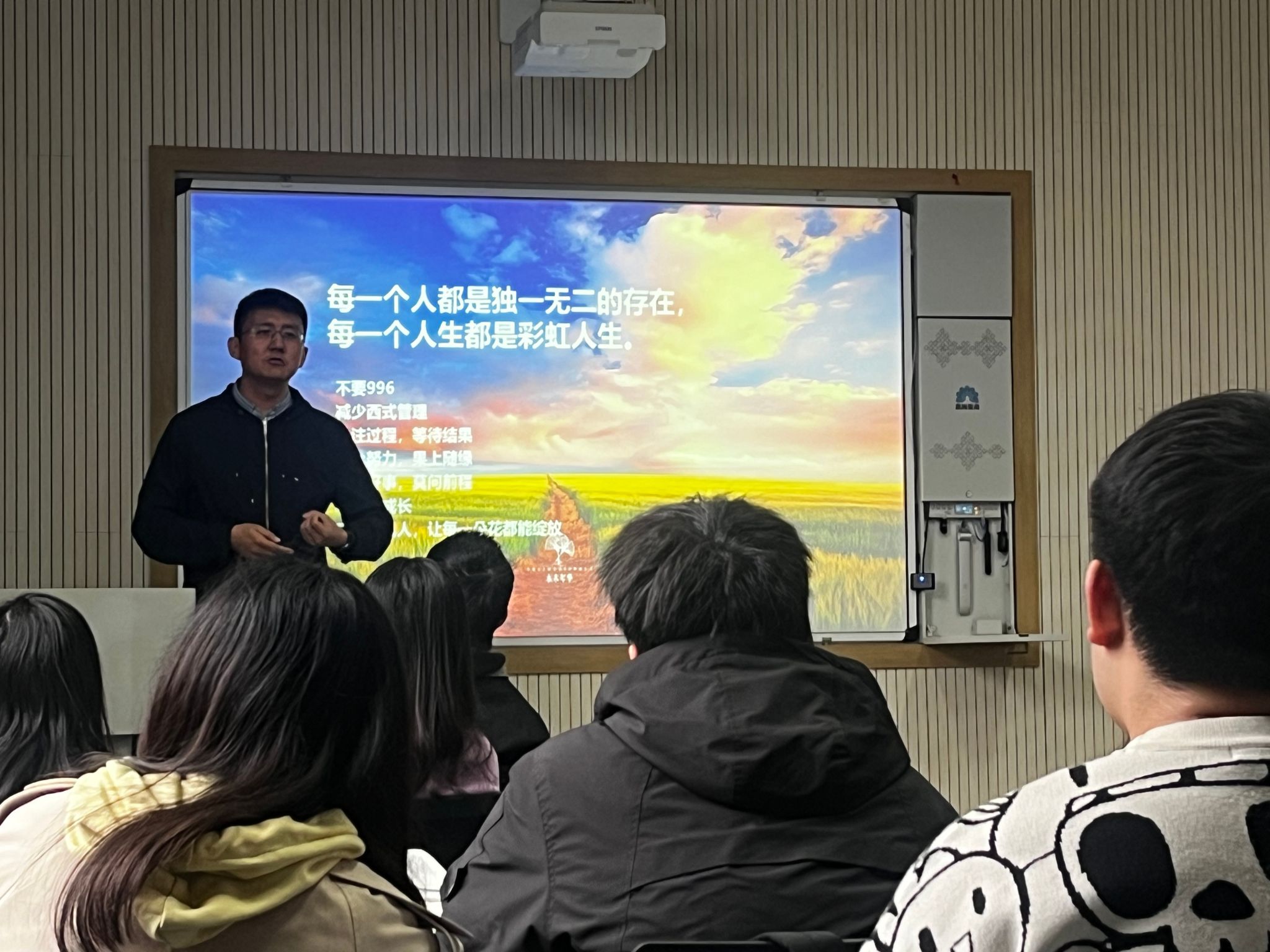刘强从自己的人生经历讲起,担任国企、民企高管,为追寻自己内心的方向,辞职创业。他分享了辞职后骑行西藏60天的真实经历,一路与来自五湖四海的骑友同行,目光所及,皆是美景,感受到前所未有的内心宁静,心如湖水,明净、澄亮,骑行路上更坚定了创业的方向。他讲述了水木年华公司是如何诞生的,“一间房、一个人、一把椅,从早想到晚,我们公司是要做什么?究竟提供什么服务?为谁服务?想明白之后‘一生有你’就成为水木年华的底层思维方式。”并且详细介绍了水木年华的创业初心、经营现状、管理制度、免费麻将-免费麻将游戏下载以及未来的战略规划。秉持“要做一个对社会有价值的企业,让有贡献者必有回报,企业盈利和快乐工作都要”的经营理念,不要996、减少西式管理......以胖东来为榜样,吸引志同道合的人,用行动来创造幸福的工作环境,打造“幸福”的免费麻将-免费麻将游戏下载。最后,他衷心祝愿同学们“要勇敢的活在当下”,毕竟“每个人都是独一无二的存在”。