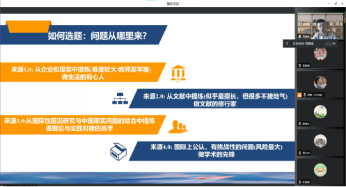 贾建锋老师以自己职业生涯切身经历为引,点出本次讲座的关键话题——好的选题是研究成功的开始……,围绕该主题,贾老师从问题自何而来、寻找有趣且重要管理研究问题的策略有哪些、如何根据发现的问题讲出好的故事三个方面展开分享。
