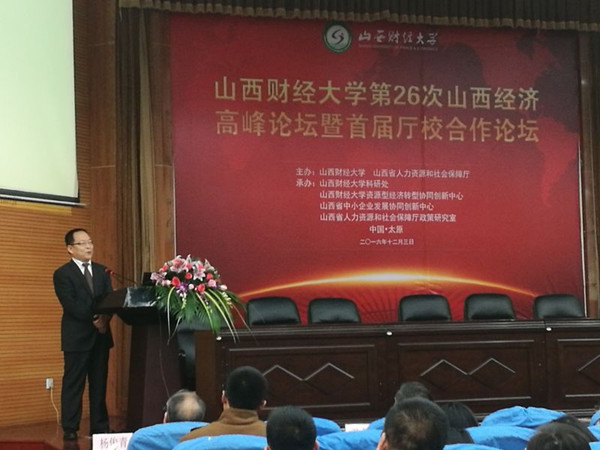 刘维奇校长代表学校致辞,对各位专家学者表达了热烈欢迎和真挚感谢。他指出,自2002年我校发起首次“山西经济高峰论坛”以来,14年间论坛紧密切合我省经济社会发展中亟待解决的重大问题,精准献计献策,现已成为省内外专家学者、业界精英智慧碰撞,共商我省发展大计的高层次对话平台。此次论坛由山西财经大学和山西省人力资源和社会保障厅共同主办,开启了“厅校合作”元年。省人社厅作为山西省经济转型发展的核心部门,在就业创业、社会保障、人事制度改革等诸多方面发挥着优化顶层设计、探索制度创新的重要引领作用,与山西财经大学经济管理类优势学科具有一衣带水的天然联系。山西财经大学将积极发挥财经类学科优势和专业资源,以服务决策咨询为重要目的,提供持续的知识输出和智力支持,促进厅校合作。作为我省一所财经类高校,刘维奇表示,我们将继续发挥“山西经济高峰论坛”智库作用,将这一论坛品牌传承下去,积极服务山西省经济转型发展;继续优化“山财智库”,充分发挥我校学科优势、智力优势、资源优势,服务地方经济发展,努力建成特色鲜明的专业化高端智库。