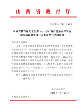 近日,2022年山西省高校课程思政教学设计大赛落下帷幕。根据《山西省教育厅关于公布2022年山西省普通高等学校课程思政教学设计大赛获奖名单的通知》(晋教高函〔2022〕45号),免费麻将游戏下载
