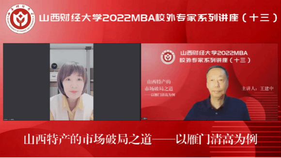 主办、山西财经大学第十六届MBA联合会承办的山西财经大学2022MBA校外专家系列讲座第十三期在“腾讯会议”平台圆满举办。山西执行力企业管理咨询有限公司总经理王建中带来了题为《山西特产的市场破局之路——以雁门清高为例》的专题讲座,2022级MBA学员、部分MBA教师、MBA校友、雁门清高产品团队等300余人参加,本期讲座还得到MBAChina网站的同步转播。