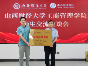 为山西慧源人力集团颁发“实践教学基地”牌匾,并为工会主席、副总经理冯伟、副总经理康志龙颁发校外实践导师聘书。(薛靖涛 供稿)