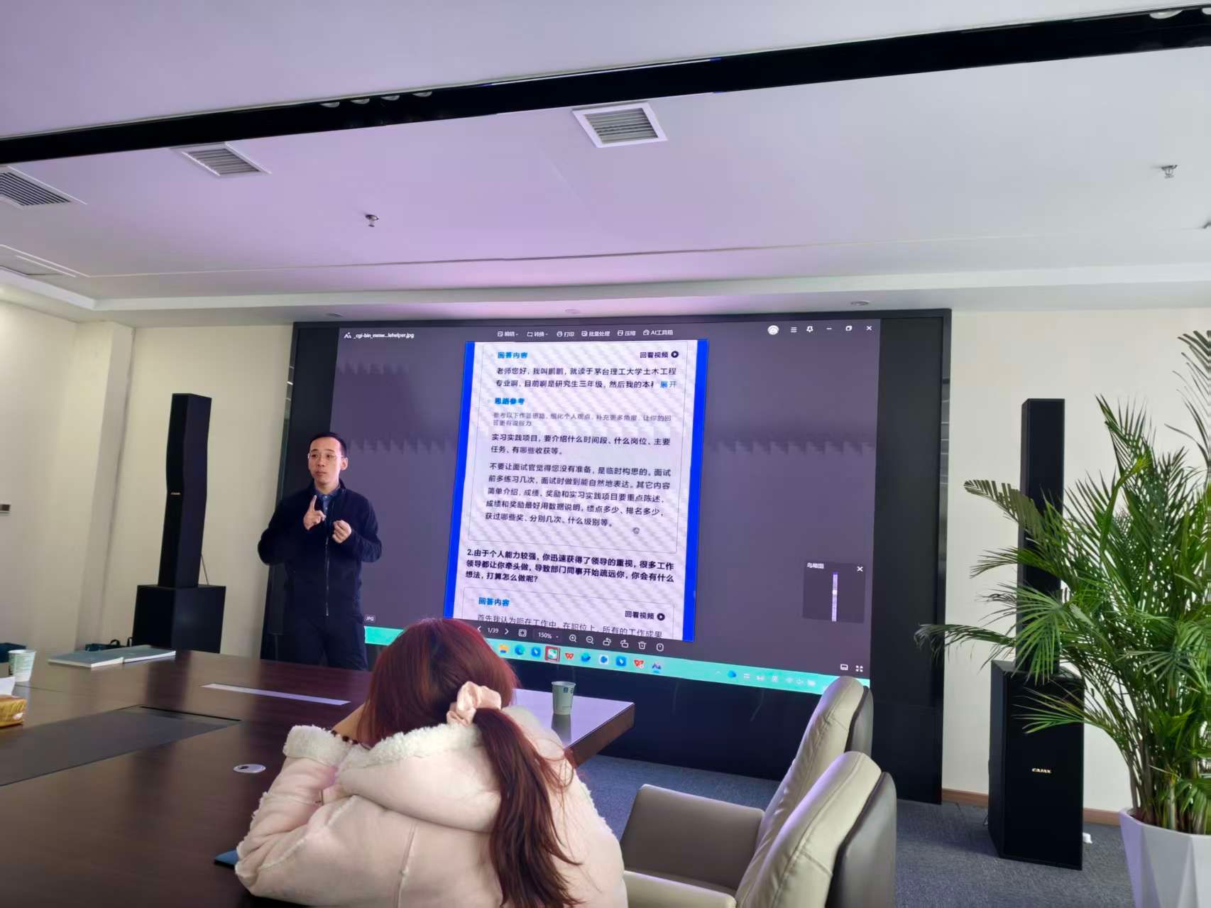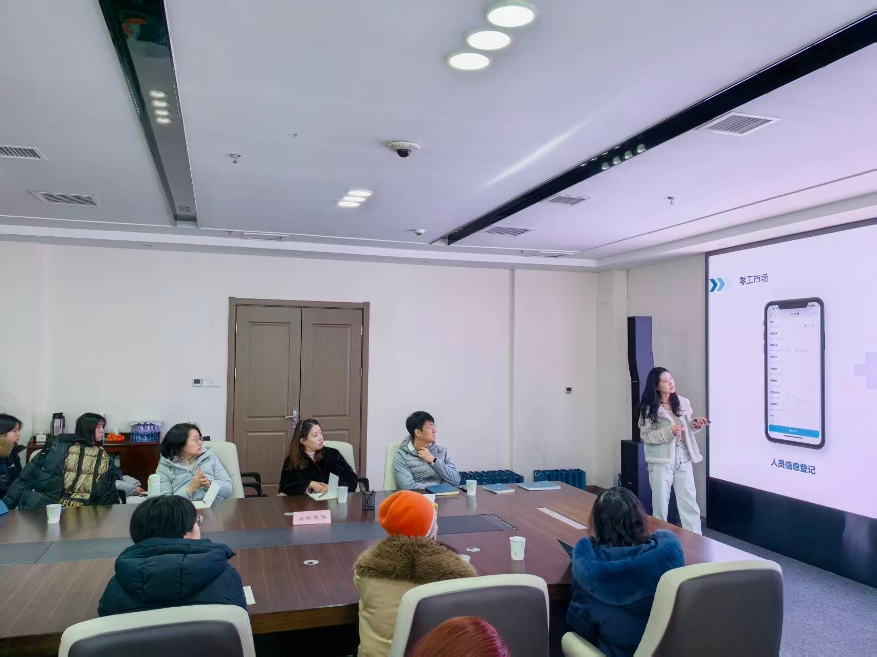 随后,开发部侯倩对公司发展历程及主要产品及服务进行详细介绍,结合零工市场国家政策及行业趋势解释了零工经济、灵活就业人员、自由职业者等基本概念,介绍了水木年华如何针对不同的零工市场需求所开发的差异化品牌和产品,并结合3个案例对公司所开发的灵活用工平台进行了讲解。随后,太原人力资源产业园朱总与智联招聘耿翔经理带领学生们借助AI技术,对心仪的岗位进行模拟面试。面试结束后,每位同学都收到了模拟面试官对自身面试表现的评分及点评。耿经理基于生成的面试报告为同学逐一解释面试中的注意事项及未来如何提升自身面试表现的方法。