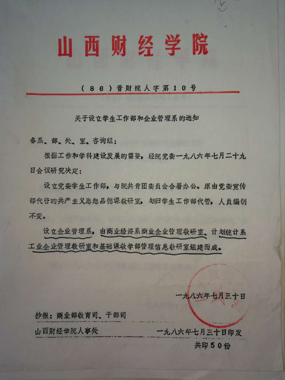 1986年7月29日,山西财经免费麻将 党委决定设立企业管理系,由商业经济系商业企业管理教研室、计划统计系工业企业管理教研室和基础部课教学部管理信息教研室组建而成。1994年5月10日,山西财经免费麻将 党委会议研究,决定将企业管理系更名为工商管理系。