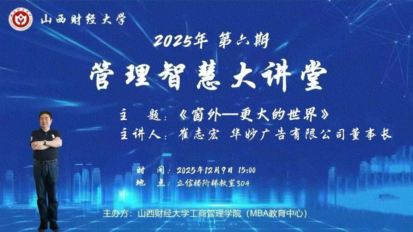 12月9日下午,工商管理学院“管理智慧大讲堂”2025年第六期在立信楼阶梯教室304成功举办。我院优秀校友、MBA校外导师、太原市华妙广告有限公司董事长崔志宏先生应邀作题为《窗外——更大的世界》的专题讲座。学院2024级200余名同学参加了本次讲座。本次讲座由学院党委副书记周志刚主持。