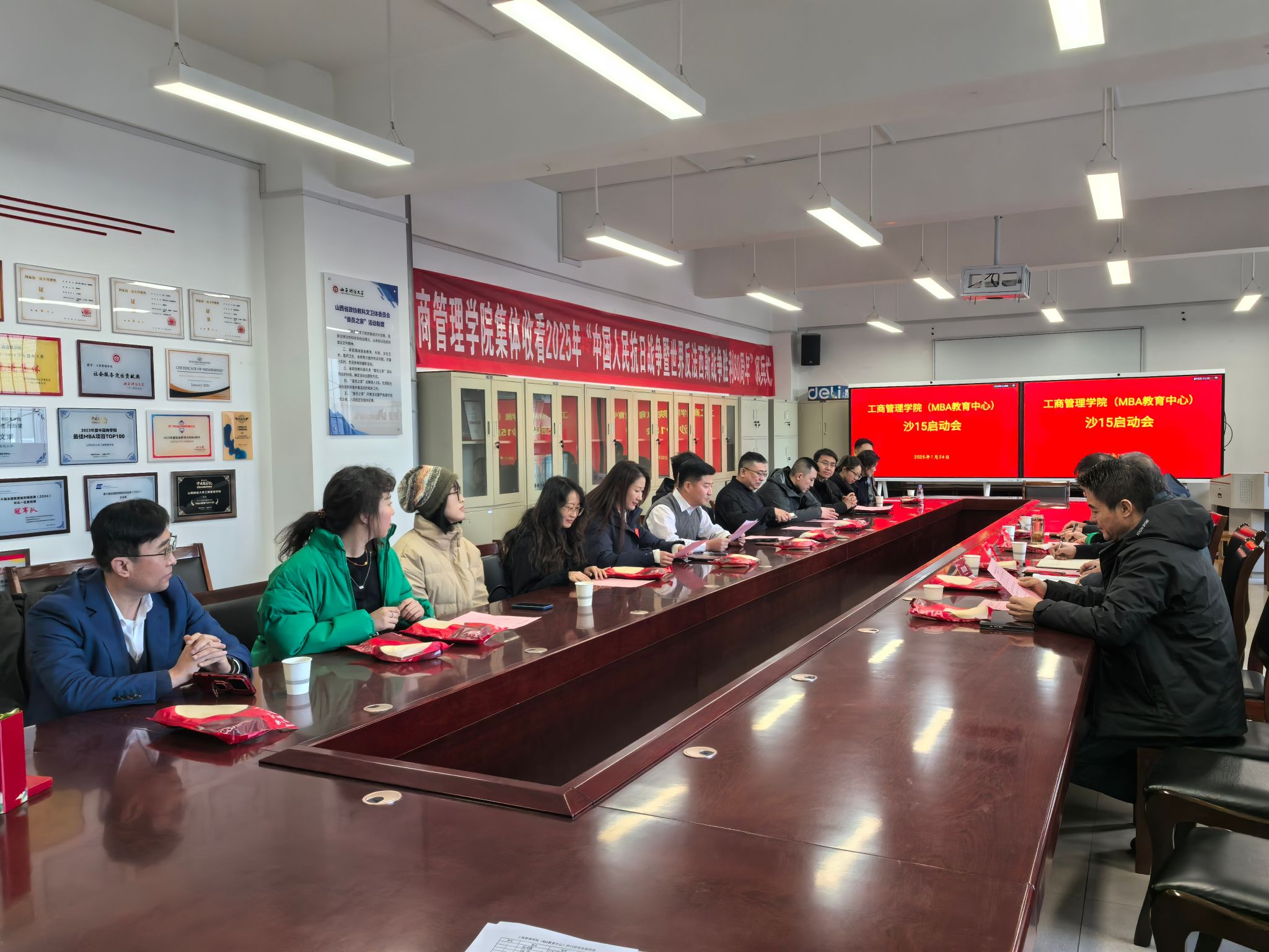 1月24日上午,以“凝心聚力战沙15,财大荣光共铸就”为主题的山西财经大学MBA沙15战队筹备启动会于学院会议室隆重举行。会议采用线上线下同步直播的方式进行,由2018级MBA校友徐强主持。学院党委书记李群生、副书记周志刚、副院长薛继东、工商管理学院校友会会长郭海明、校友代表丰开庆、沙赛组委会代表宋煜以及全体沙15预备队员共同出席了本次动员大会。会议旨在统一战队思想、明确赛事规则、拆解筹备任务、凝聚团队共识,为沙15征程奠定坚实的组织与思想基础。