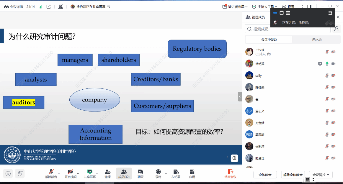 徐艳萍副教授首先介绍了自己的教育背景与研究历程,并系统梳理了长期聚焦的两大研究方向:一是中国情境下的审计问题研究,关注审计师网络、信息传递与审计质量;二是法律制度与企业契约行为研究,探索司法环境对企业行为的影响。