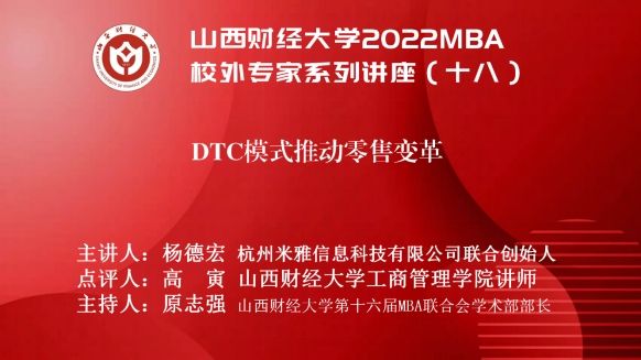 主办、山西财经大学第十六届MBA联合会承办的山西财经大学2022MBA校外专家系列讲座第十八期在“腾讯会议”平台圆满举办。杭州米雅信息科技有限公司联合创始人杨德宏博士带来了题为《DTC模式推动零售变革》的专题讲座,2021、2022级MBA学员、部分MBA教师、MBA校友等300余人参加,本期讲座还得到MBAChina网站的同步转播。