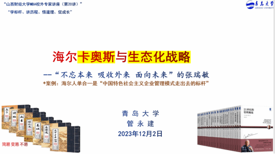 主办、山西财经大学第十七届MBA联合会承办的山西财经大学MBA校外专家系列讲座(第二十期)在立信楼一层报告厅成功举办。青岛大学党委组织员、山西财经大学MBA校外导师管永建老师带来题为《海尔卡奥斯与“生态化战略”》的专题讲座。本期讲座得到MBAChina网站的同步直播,2022级、2023级MBA学员、部分MBA教师、MBA校友线上线下共2000余人参加了讲座。