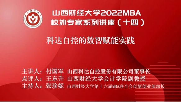 主办、山西财经大学第十六届MBA联合会承办的山西财经大学2022MBA校外专家系列讲座第十四期在“腾讯会议”平台圆满举办。山西科达自控股份有限公司董事长付国军带来了题为《科达自控的数智赋能实践》的专题讲座,2022级MBA学员、部分MBA教师、MBA校友、科达自控管理团队等300余人参加,本期讲座还得到MBAChina网站的同步转播。