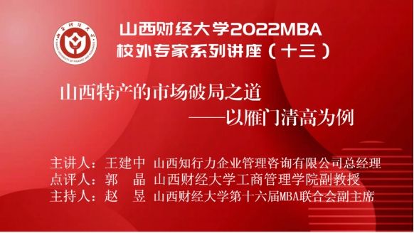 主办、山西财经大学第十六届MBA联合会承办的山西财经大学2022MBA校外专家系列讲座第十三期在“腾讯会议”平台圆满举办。山西执行力企业管理咨询有限公司总经理王建中带来了题为《山西特产的市场破局之路——以雁门清高为例》的专题讲座,2022级MBA学员、部分MBA教师、MBA校友、雁门清高产品团队等300余人参加,本期讲座还得到MBAChina网站的同步转播。