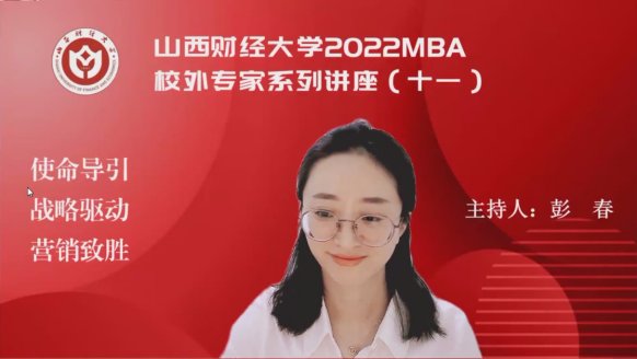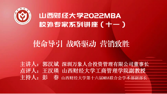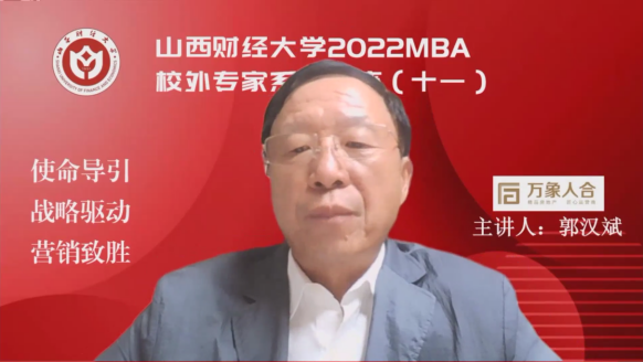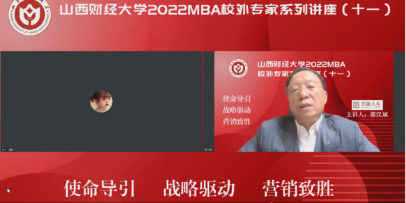 主办、山西财经大学第十六届MBA联合会承办的山西财经大学2022MBA校外专家系列讲座第十一期在“腾讯会议”平台圆满举办。深圳万象人合投资管理有限公司创始人郭汉斌先生带来了题为《使命导引 战略驱动 营销致胜》的专题讲座,2020级、2021级MBA学员、2022级拟入学MBA学员、部分MBA教师、MBA校友等近300人参加,本期讲座还得到MBAChina网站的同步转播。