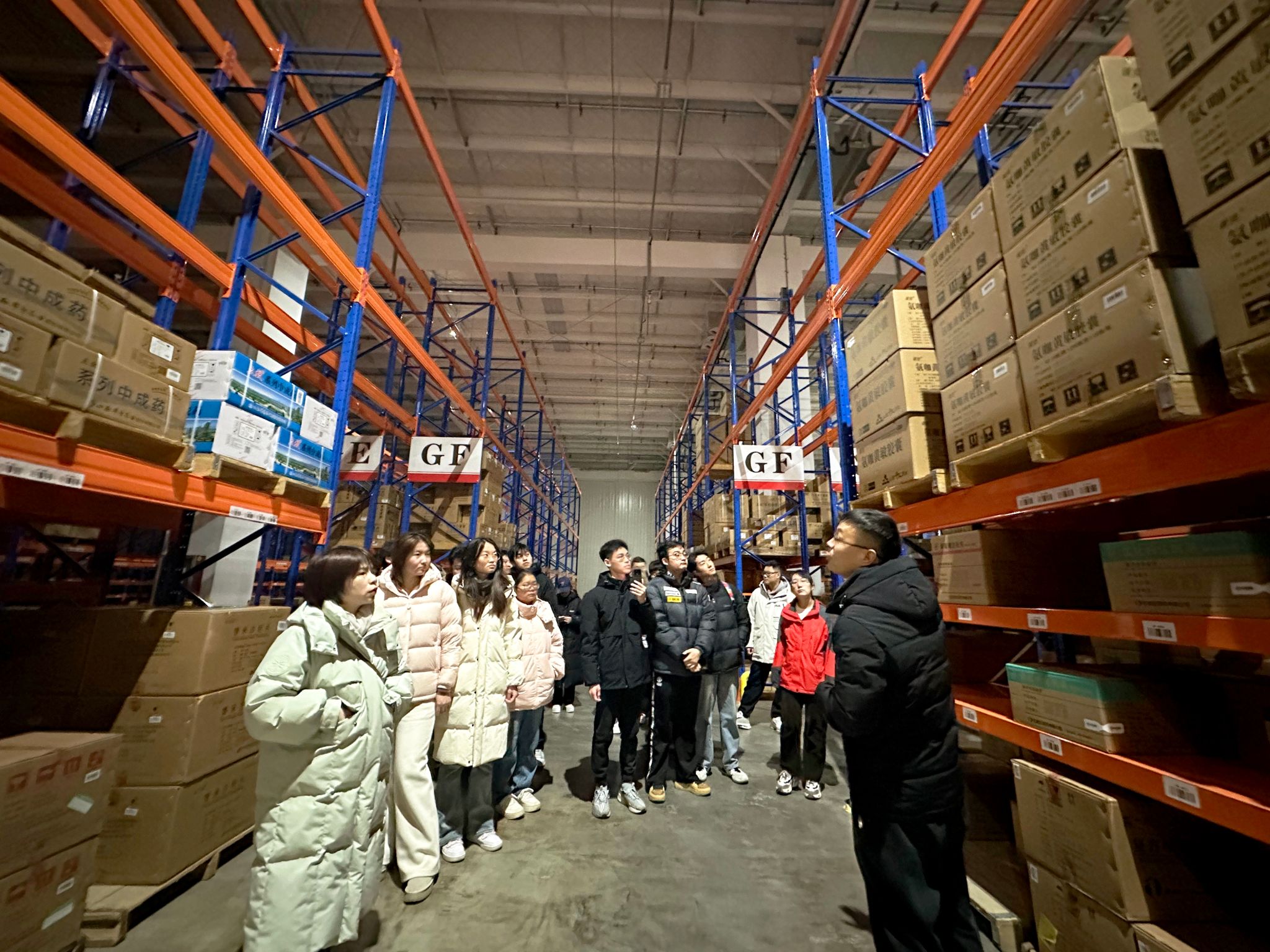 随后,师生一行来到仓储作业区,完整观摩了从补库、入库到出库的全流程作业。在入库环节,工作人员演示了药品到货验收、系统录入、托盘码放及输送线分配等步骤;在补库区,大家了解到如何根据系统指令实现库内货位的动态调整与优化;而出库环节则集中展示了订单分拣、复核包装、配送交接等流程的高效协同。整个过程中,自动化传送带、电子标签拣选系统、智能搬运机器等设备的配合运转,生动诠释了现代物流系统的高精度与快节奏。